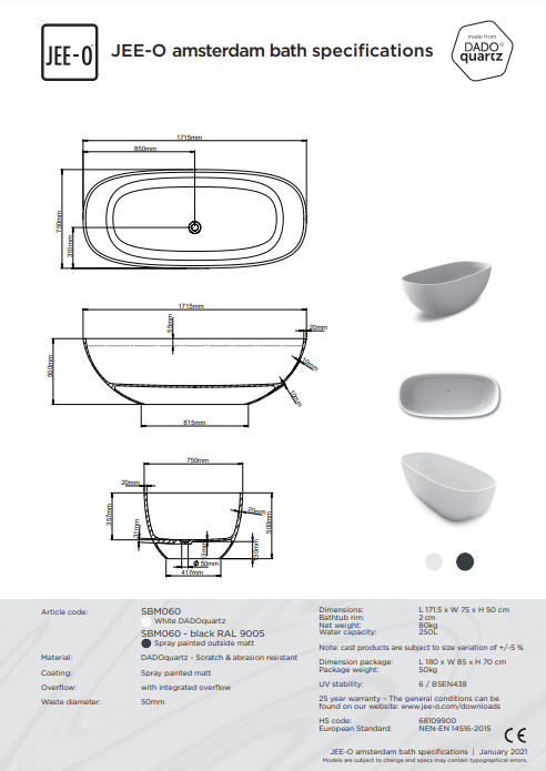 Het  Amsterdam bad van JEE-O is verkrijgbaar in de kleuren: Wit en Buitenzijde Zwart, Terra roze, Silver, Brons, Goud, Dark Steel.