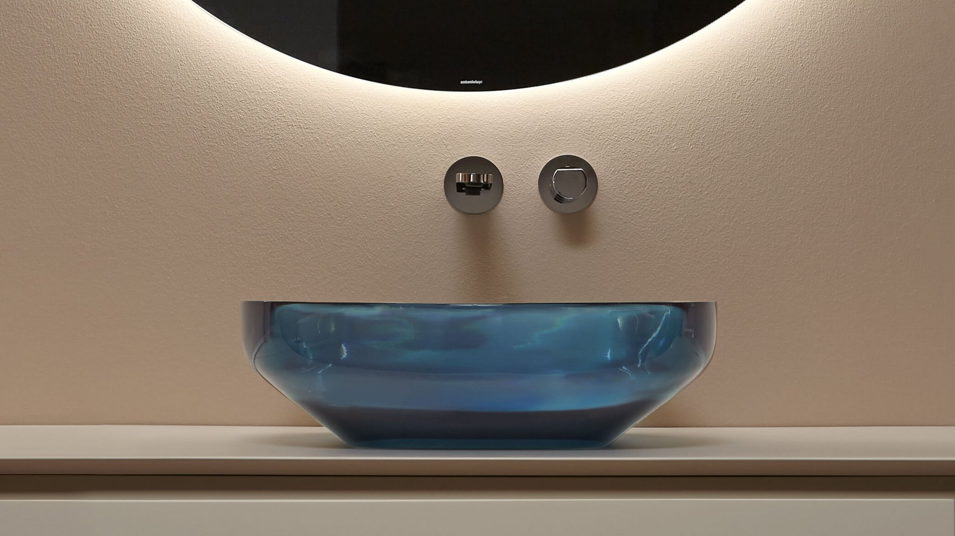 Antonio Lupi Ago3c en Ago60c waskom, Ovale opzetspoelbak in Cristalmood of Icemood, leverbaar in diverse kleuren compleet met open plug, sifon en buis.