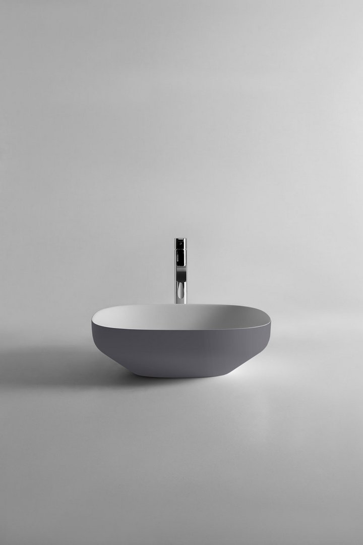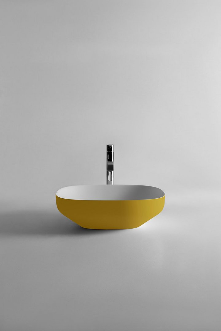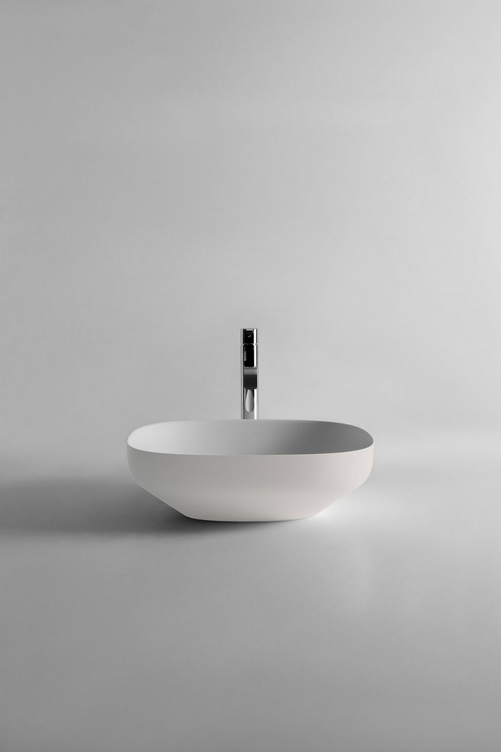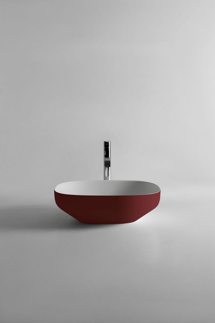 Antonio Lupi Ago3 waskom, Rechthoekige opzetspoelbak in materiaal Flumood- of Colormood, compleet met sifon en open plug. Verkrijgbaar bij Stone Company.