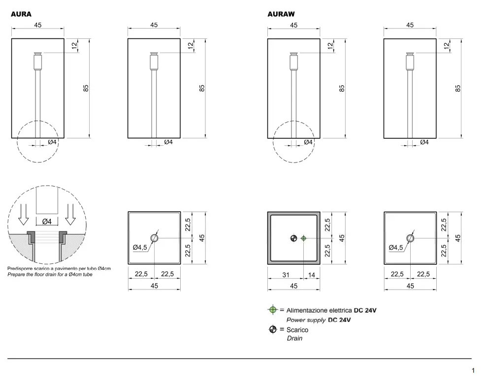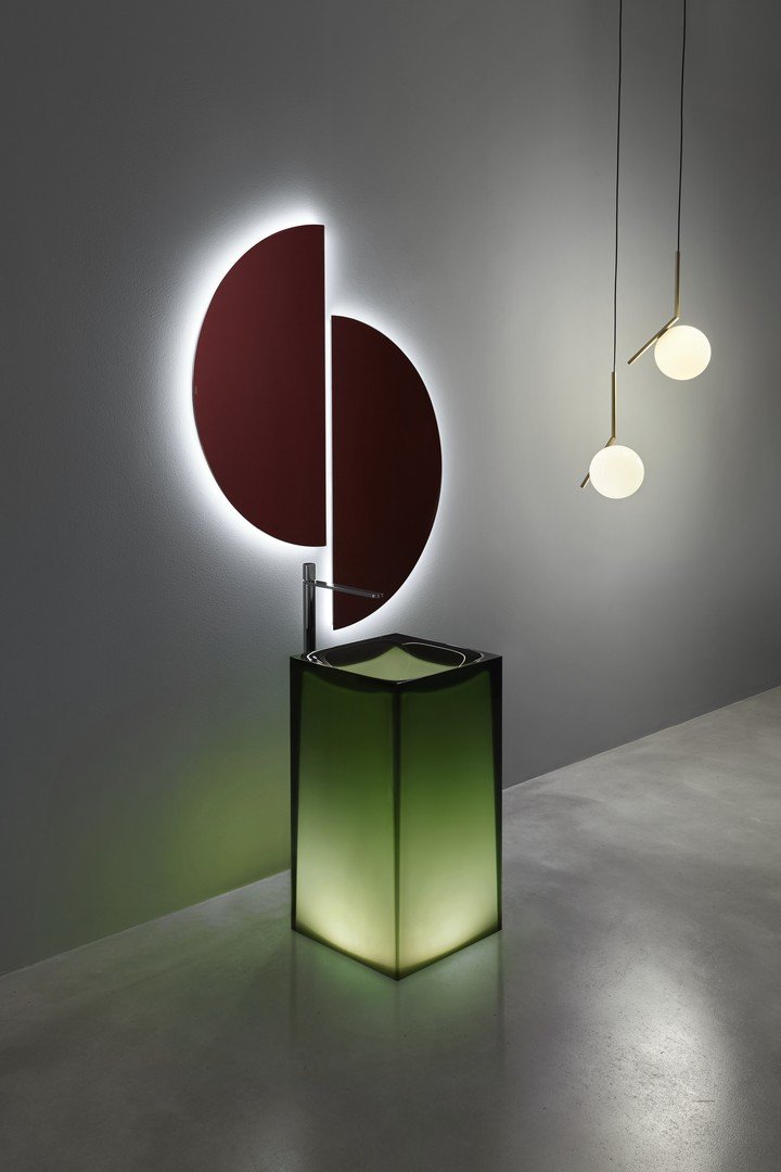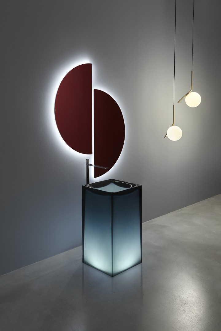 Antonio Lupi Aura en Auraw wastafel, Vrijstaande wastafel in Cristalmood of Icemood met vloerafvoer, met (of zonder) ledverlichting, compleet met open plug, sifon en buis.