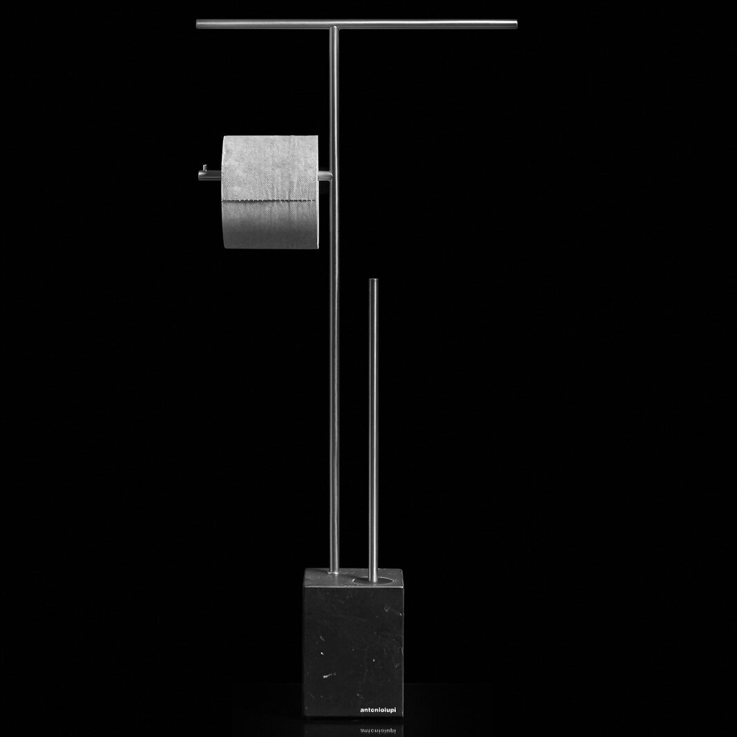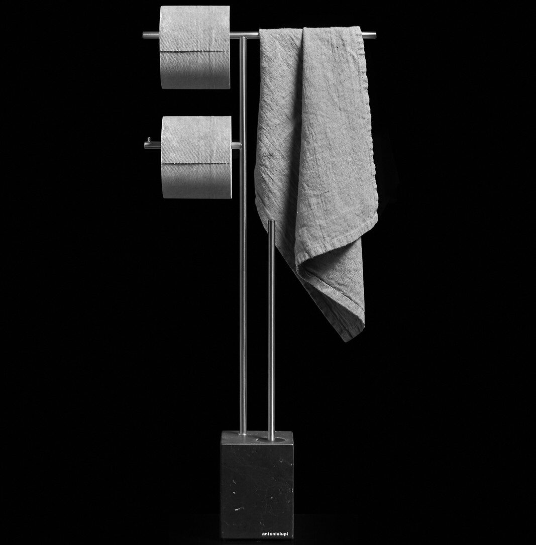 De Antonio Lupi BivioCombi2 is een elegante, vrijstaande 3-in-1 set: handdoekhouder, toiletrolhouder en toiletborstelhouder in één strak geheel. De marmeren voet in Carrara of Nero Marquinia geeft stabiliteit en een luxe uitstraling. De slanke structuur in gelakt messing is af te werken in mat wit of reliëf gelakt volgens de kleurkaart, en is ook verkrijgbaar in satijnstaal of gepolijst chroom om perfect te matchen met uw kranen. Dankzij het vrijstaande ontwerp is boren niet nodig en verplaatst u de set eenvoudig bij een nieuwe indeling. Compact in maat, praktisch in gebruik en ideaal voor stijlvolle toiletten, gastenbadkamers en hotels.