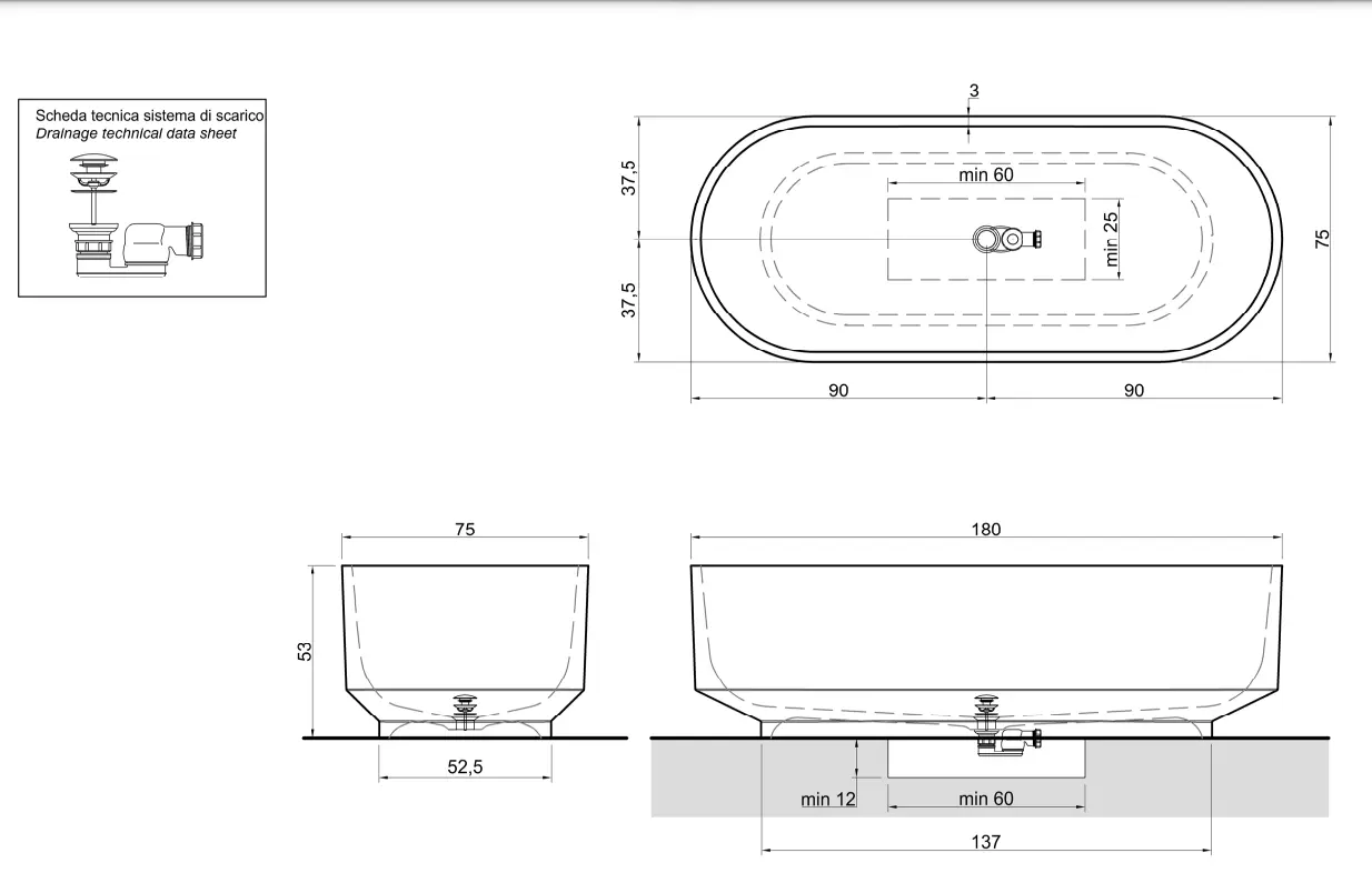Antonio Lupi BORGHI180 bad, ovaal ligbad Cristalmood (glans) of Icemood (mat) leverbaar in diverse kleuren compleet met afvoer, drukplug, sifon en flexibele slang.