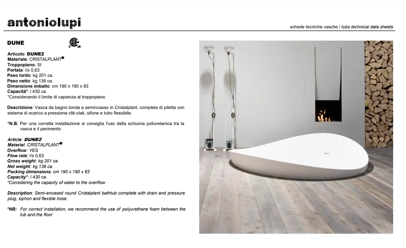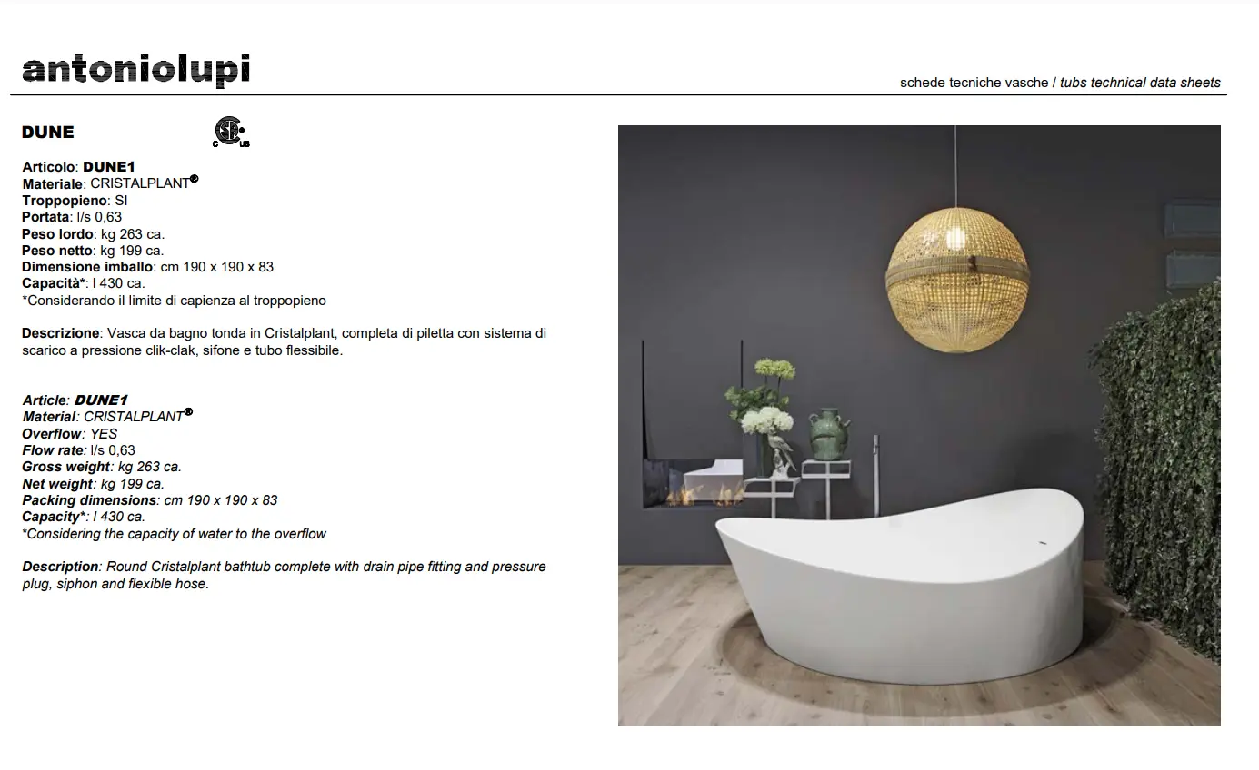 De Antonio Lupi Dune baden zijn verkrijgbaar in twee modellen: Dune1 en Dune2. Het Dune1 model, een rond Cristalplant bad, wordt geleverd met een complete set afvoerpijp, drukplug, sifon en flexibele slang. Aan de andere kant biedt het Dune2 model een semi-omhuld rond Cristalplant bad, ook inclusief afvoer en drukplug, sifon en flexibele slang. Deze baden zijn niet slechts producten, maar eerder sculpturen die de esthetiek van de badkamer naar nieuwe hoogten tillen.