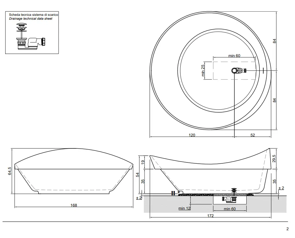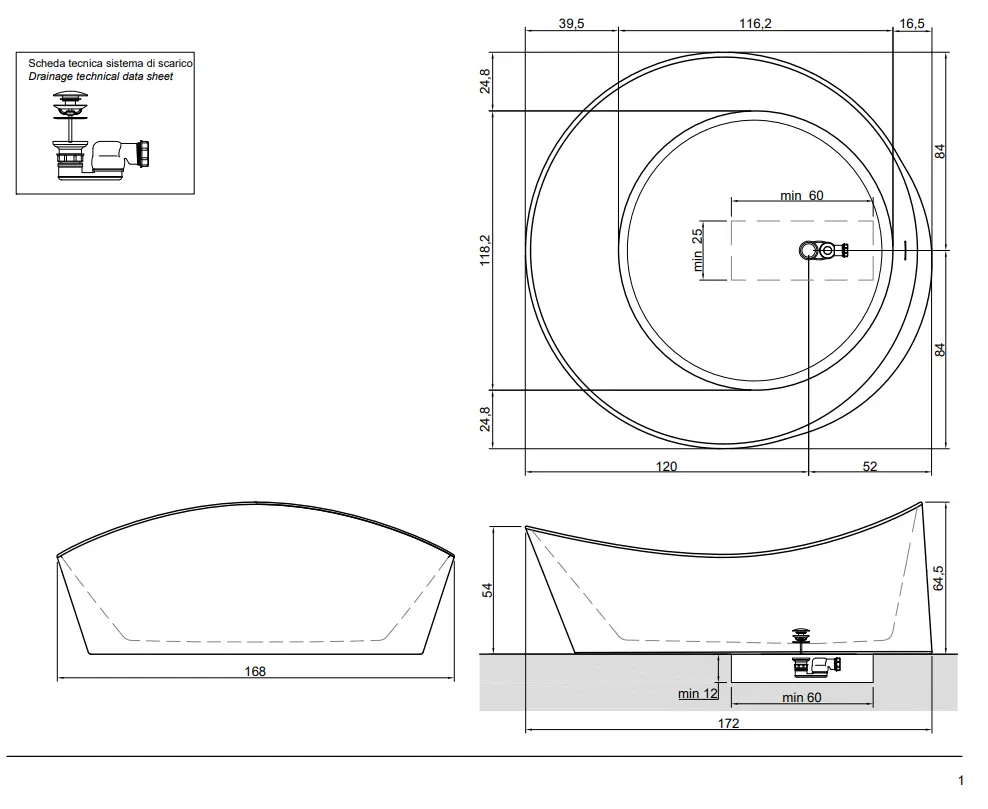 Afmeting in cm Artikelcode Dune1 (vrijstaand bad): L 172 x P 168 x H 64,5