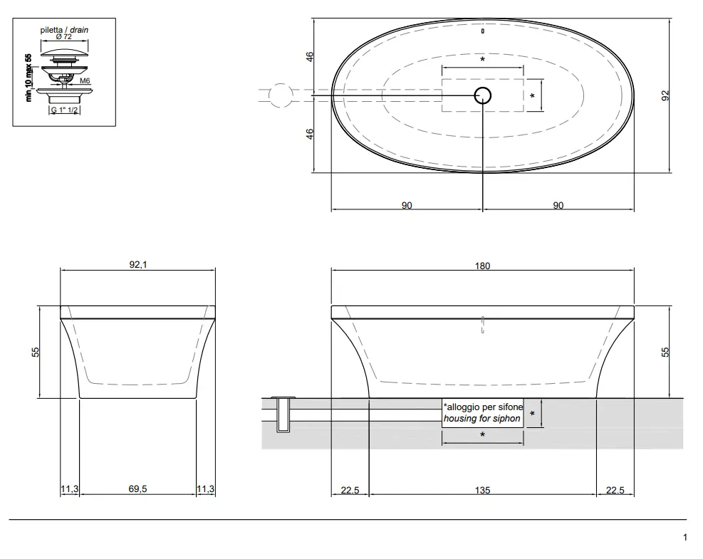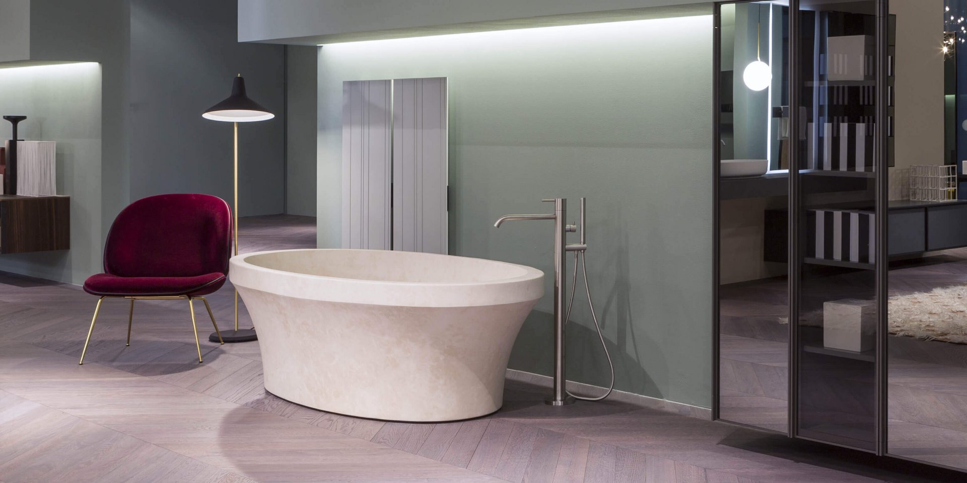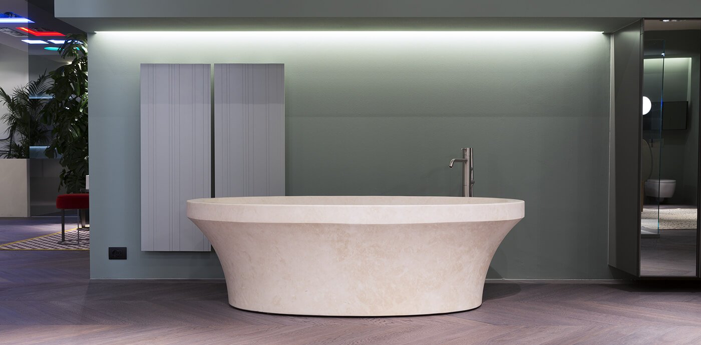 Antonio Lupi Epoque bad, ovaal ligbad, leverbaar in diverse kleuren compleet met afvoer, drukplug, sifon en flexibele slang. Verkrijgbaar bij Stone Company.
