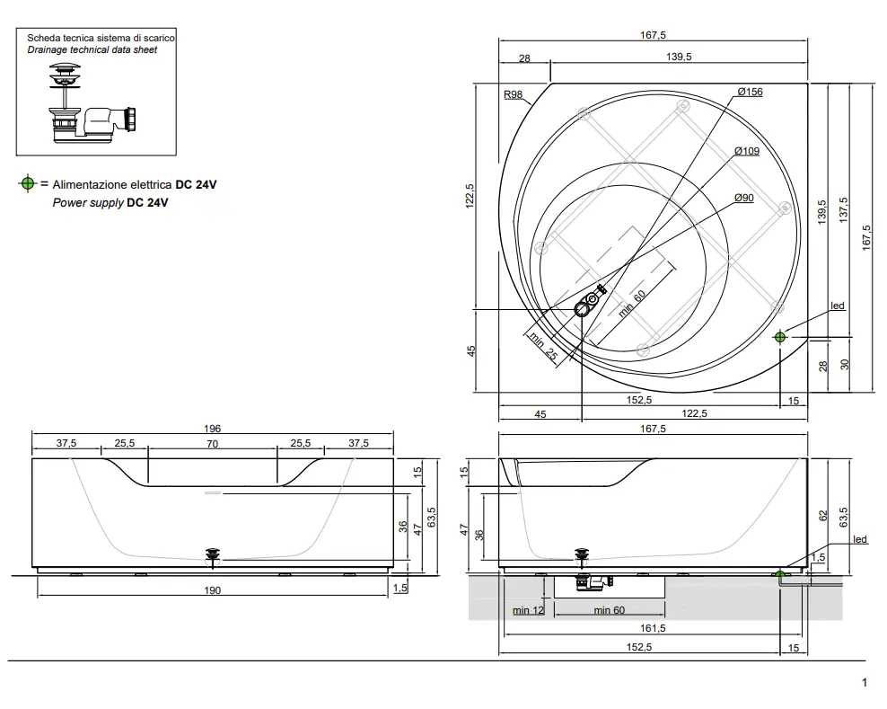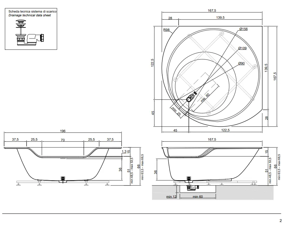 Afmeting in cm Ofuro2 (inbouw bad): L 167,5 x P 167,5 x H 63,5 / 68,5