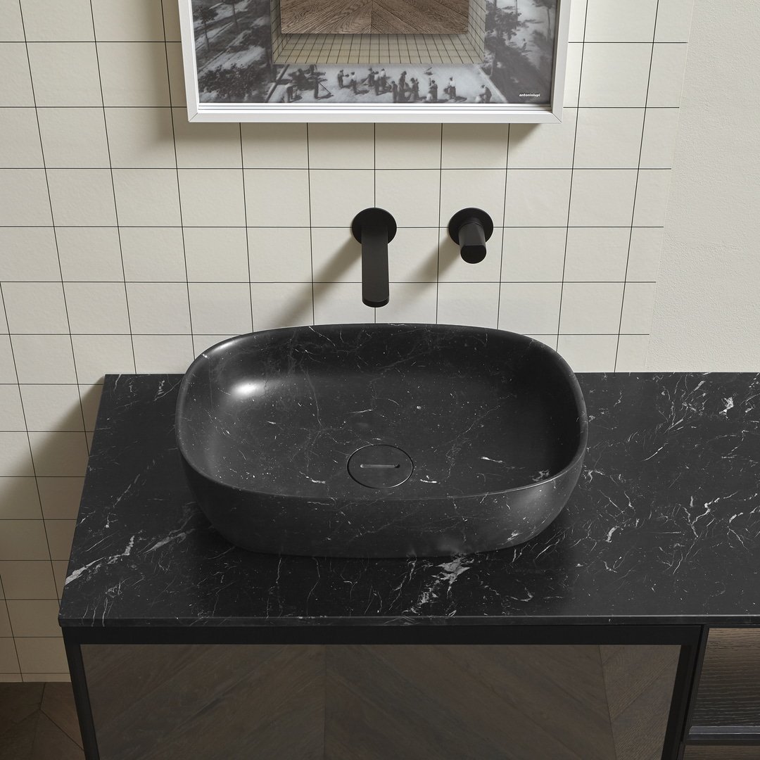 Antonio Lupi Senso160 waskom, Ronde opzetspoelbak in Marmer of Natuursteen en in diverse kleuren compleet met afvoerpijpfitting en open plug. Verkrijgbaar bij Stone Company.