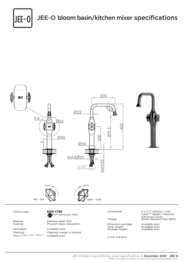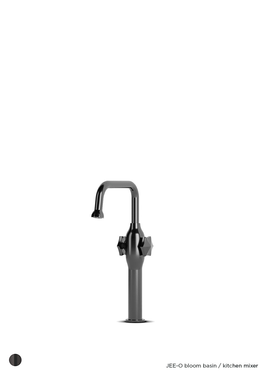 Bloom wastafelkraan JEE-O, Opbouw wastafelkraan gemaakt van RVS en bevat een tweegreepsmengkraan. Deze kraan is ook geschikt als keukenkraan en is verkrijgbaar in de kleur Gun metal. Nu verkrijgbaar bij