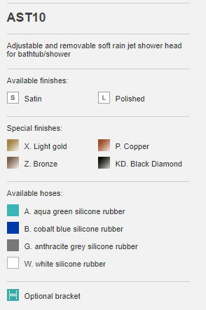 - De uitloop van de handdouche (AST10) is tevens leverbaar in de kleuren koper, brons, licht goud en zwart, zowel geborsteld als gepolijst RVS.