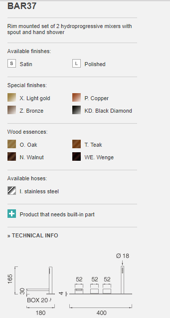 Roestvrij staal is sterk en eenvoudig schoon te maken met een zachte doek en milde zeep. Zo krijgt u een moderne CEA badkamer met een rustige look en een set die lang meegaat en het is ideaal voor moderne interieurs, wellnessruimtes en hotels. BAR37 wordt geleverd met het inbouwdeel. Er is ook een slangen en aansluitkitt beschikbaar als alternatief bij de montage. Uitvoering in roestvrij staal met keuze uit afwerkingen zoals geborsteld, gepolijst, Black Diamond, Bronze, Copper en Light Gold.