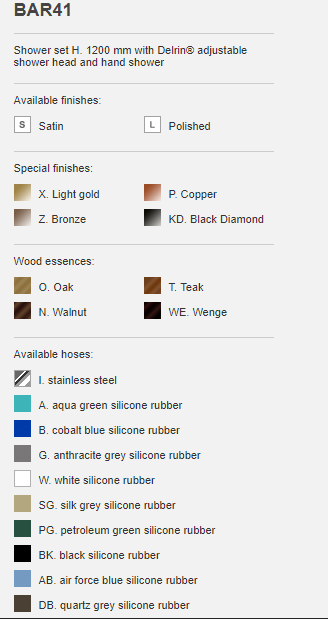 • De doucheset (BAR41) is tevens leverbaar in de kleuren koper, brons, licht goud en zwart, zowel geborsteld als gepolijst, op aanvraag. Zie bijgevoegde productafbeeldingen.