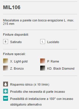 MIL106 is een inbouw wandmengkraan met twee delen. De bediening zit aan de muur en de uitloop hangt boven de wastafel. U bedient water en temperatuur met één hendel. De uitloop geeft een elegante uitstraling en laat het water mooi in het midden vallen. De zachte straal vermindert spatten en voelt comfortabel aan. Ideaal bij handen wassen, gezicht reinigen en snel afspoelen. De uitloop heeft een lengte tot maximaal 215 millimeter. De perlator levert circa 5 liter per minuut. Dat bespaart water en houdt de straal prettig zacht. De set heeft een inbouwdeel nodig voor montage achter de wand. De slanke vorm matcht makkelijk met opzetkommen en meubelwastafels. De kraan past bij moderne badkamers, wellnessruimtes en hotels.