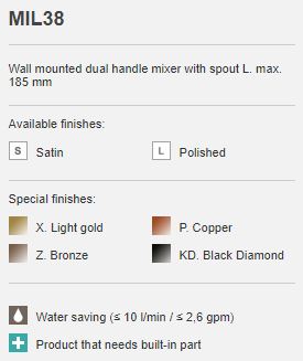 MIL38 is een 3-gats wandmengkraan: links en rechts een knop voor warm en koud, in het midden de uitloop. U stelt temperatuur en waterhoeveelheid precies in. Wandgemonteerde mengkraan met twee knoppen en uitloop. De uitloop heeft een maximale lengte van 185 millimeter. De waterstraal valt daardoor netjes in de kom, ideaal voor handen wassen, gezicht reinigen en snel afspoelen. De perlator levert circa 5 liter per minuut, wat water bespaart en toch comfortabel aanvoelt. De set wordt geleverd mét inbouwdelen voor montage achter de wand. Het ontwerp is tijdloos en minimalistisch. Daardoor past de kraan in moderne badkamers, wellnessruimtes en hotels. De wandmontage houdt uw werkblad overzichtelijk en makkelijk schoon. Uitvoering in roestvrij staal, met keuze uit meerdere afwerkingen zoals geborsteld & gepolijst RVS, Black Diamond, Bronze, Copper & Light Gold.