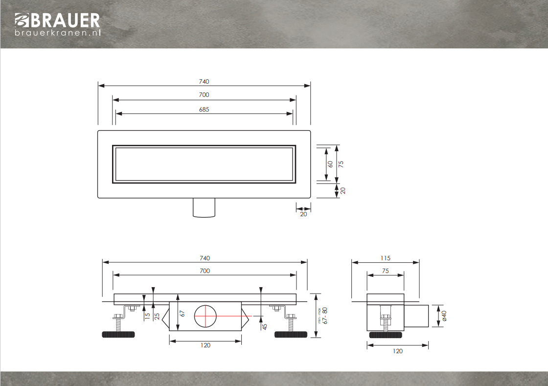 De Brauer complete tegelgoot is verkrijgbaar in verschillende maten, waardoor deze kan worden aangepast aan verschillende badkamerlay-outs en tegelontwerpen. De beschikbare maten variëren om te voldoen aan de specifieke behoeften van diverse klanten, waardoor een nauwkeurige installatie mogelijk is. U kunt kiezen uit maten die variëren van 7 cm x 50 cm tot 7 cm x 200 cm, waardoor de tegelgoot perfect past bij de afmetingen van uw doucheruimte. Bovendien is de tegelgoot verkrijgbaar in verschillende hoogwaardige afwerkingen, waaronder roestvrij staal, koper PVD, gunmetal PVD, goud PVD en mat zwart, waardoor er voor elke badkamerstijl een geschikte optie is.
