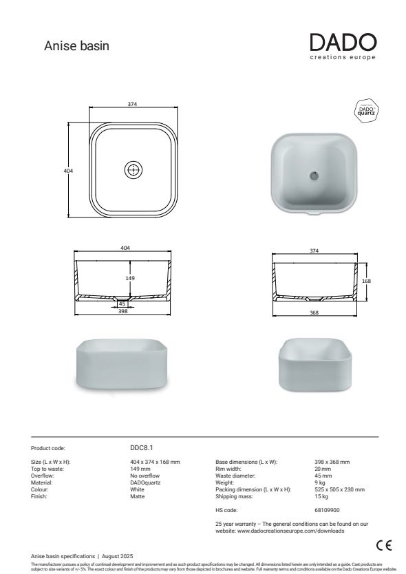 Anise is een opbouw waskom. U plaatst de kom op een blad of meubel. Ideaal voor handen wassen, gezicht reinigen en snel opfrissen. De vorm is tijdloos en minimalistisch, waardoor de waskom past in elke stijl. De matte afwerking voelt zacht aan en dempt licht, wat rust geeft in de ruimte. De kom heeft geen overloop. De afmetingen zijn 404 bij 374 bij 168 millimeter. De afstand van bovenzijde tot het afvoergat is 149 millimeter. De kom heeft geen overloop. Het materiaal is DADOquartz in wit, met een matte finish.