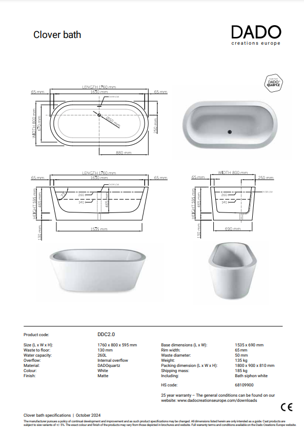Het bad meet 1760 millimeter lang, 800 millimeter breed en 595 millimeter hoog. Inhoud circa 260 liter. Interne overloop en witte badafvoer inbegrepen. Materiaal DADOquartz in mat wit. Basismaat 1535 bij 690 millimeter. Randbreedte ongeveer 65 millimeter. Afvoergat 50 millimeter. Gewicht circa 135 kilo. Door het vrijstaande ontwerp creëert u een ruimtelijk effect en zet u het bad precies waar u wilt. Combineer Clover met een vrijstaande badmengkraan of een inbouw badcombinatie. Dit model is ideaal voor thuis, een wellnessruimte of een hotelsuite waar comfort en design samenkomen.