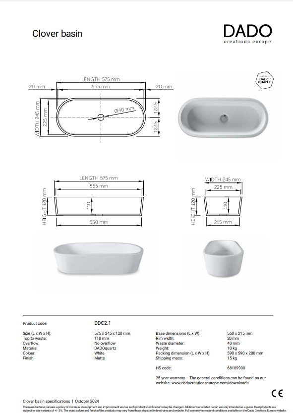 De afmetingen van de Clover waskom zijn 575 millimeter lang, 245 millimeter breed en 120 millimeter hoog. De afstand van bovenzijde tot het afvoerpunt is 110 millimeter. De kom heeft geen overloop. Het materiaal is DADOquartz in mat wit, met een basismaat van 550 bij 215 millimeter. De randbreedte is circa 20 millimeter en het afvoergat heeft een diameter van 40 millimeter. Het gewicht is ongeveer 10 kilogram. Verpakking 590 bij 590 bij 200 millimeter, verzendgewicht circa 15 kilogram. Zo is Clover een slimme keuze voor de gezinsbadkamer, het gastentoilet en luxe hotelprojecten.