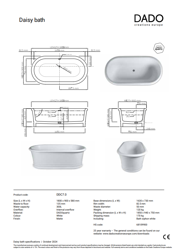 De DADOquartz Daisy bad in mat wit maakt deel uit van de elegante Daisy collectie. Dit bad combineert modern design met praktisch gebruiksgemak. Dit is een vrijstaand (vloer gemonteerd) product met ingebouwde overloop en witte bad afvoer.