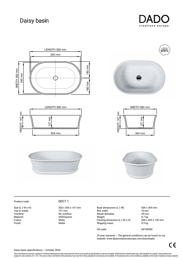 Dit product is een oase van comfort en luxe. De Daisy collectie bestaat uit een bad en een waskom. De baden en waskommen van DADOquartz zijn gemaakt van Solid Surface. De zachte, vloeiende lijnen komen ook terug in het bad en waskom van de Daisy collectie. De montage zorgt voor een minimalistische en strakke afwerking, die past in zowel moderne als klassieke interieurs.
