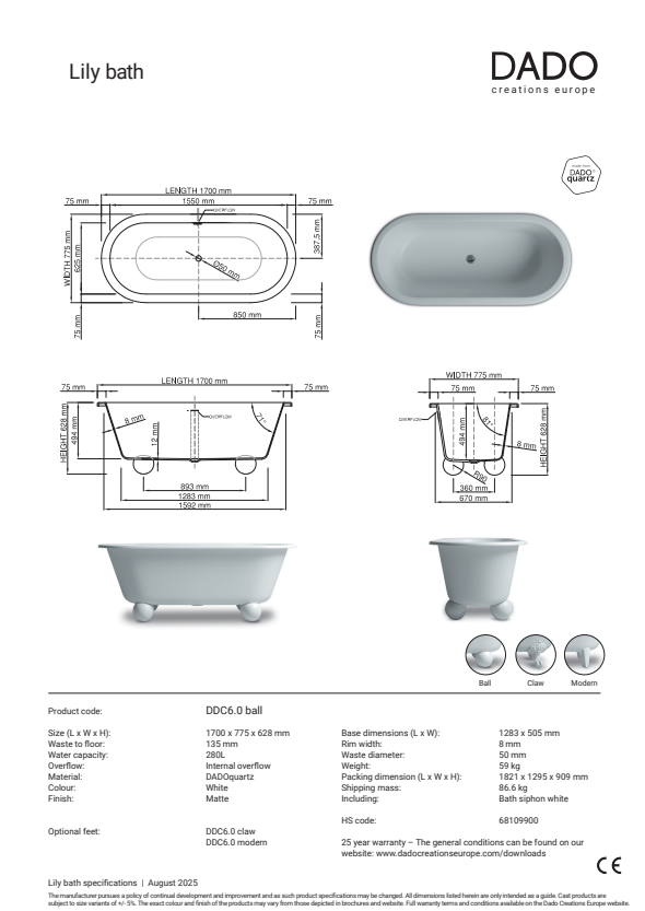 Lily collectie. Dit bad combineert modern design met praktisch gebruiksgemak. Dit is een vrijstaand (vloer gemonteerd) product met ingebouwde overloop en witte bad afvoer. De Lily collectie bestaat uit 3 verschillende baden namelijk: De DADOquartz