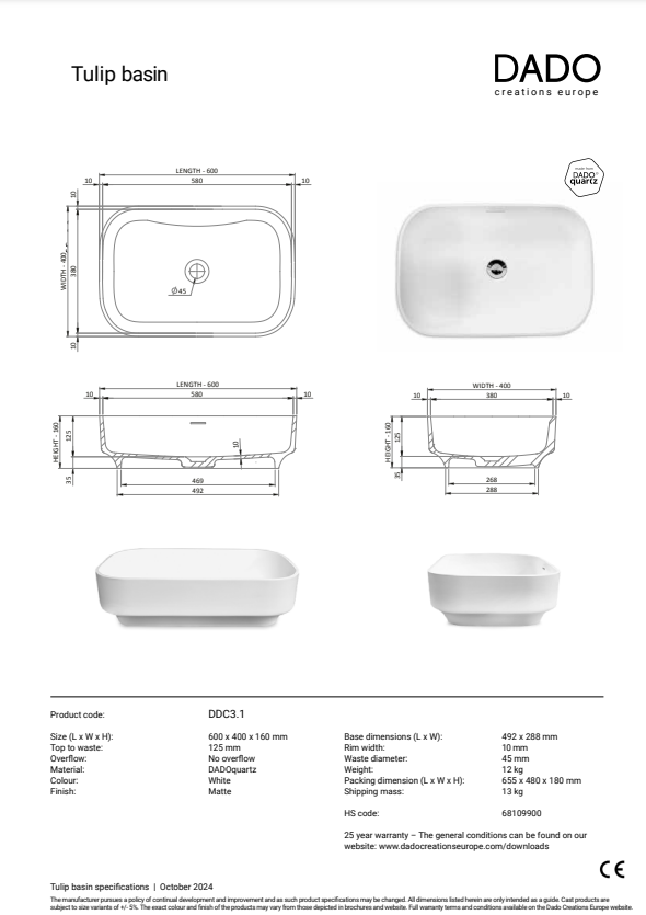 De DADOquartz Tulip waskom in mat wit maakt deel uit van de elegante Tulip collectie. Dit bad combineert modern design met praktisch gebruiksgemak. Dit is een vrijstaand product zonder ingebouwde overloop.