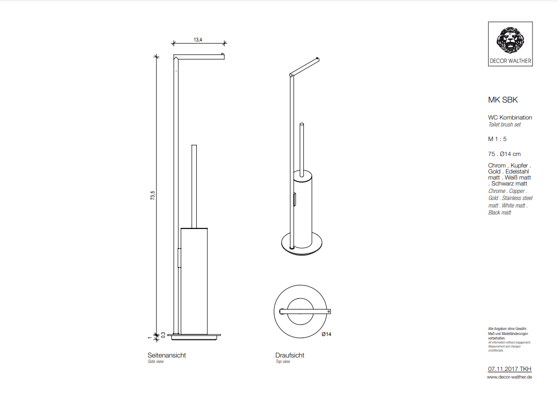 De afmetingen van de Decor Walther toiletborstel set met toiletrolhouder zijn perfect afgestemd op de behoeften van de moderne badkamer. Met een hoogte van 84 cm, breedte van 14 cm en diepte van 14,5 cm past deze set moeiteloos in diverse ruimtes. De toiletrolhouder is niet alleen praktisch maar dient ook als een gestroomlijnde toevoeging aan het geheel.
