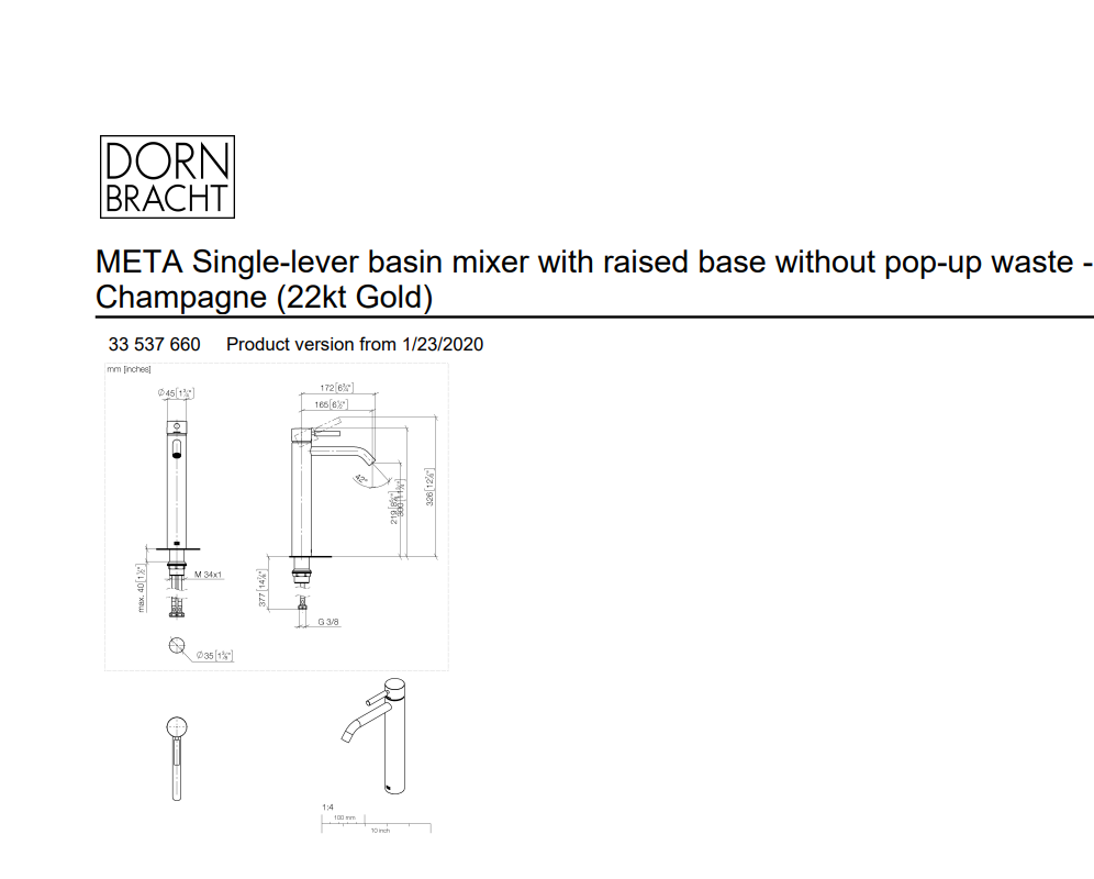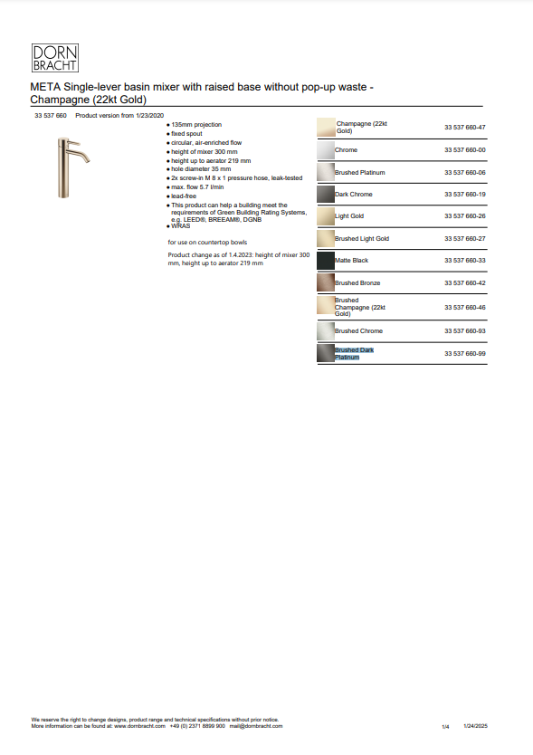 Dornbracht produceert haar producten speciaal voor haar klanten op bestelling en vallen onder maatwerk. Houd er rekening mee dat deze producten niet geruild of geretourneerd kunnen worden. Als je een Dornbracht-product bestelt, is het belangrijk om zorgvuldig te controleren of alle specificaties en afmetingen correct zijn, om onnodige teleurstellingen te voorkomen. Hierdoor kunnen levertijden variëren per afwerking en kan het langer duren voordat je jouw bestelling ontvangt. Houd er rekening mee dat de levertijden kunnen variëren afhankelijk van de specifieke afwerking van het product dat je hebt besteld.