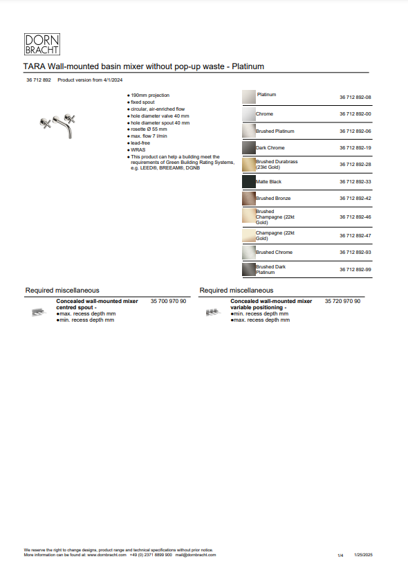 | Kleur | Brushed Bronze, Brushed Champagne, Brushed Chrome, Brushed Dark Platinum, Brushed Durabrass, Brushed Platinum, Champagne, Dark Chrome, Matte Black, Platinum |