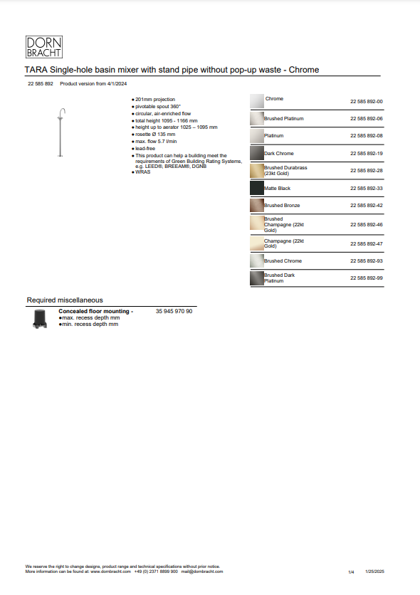 | Kleur | Brushed Bronze, Brushed Champagne, Brushed Chrome, Brushed Dark Platinum, Brushed Durabrass, Brushed Platinum, Champagne, Dark Chrome, Matte Black, Platinum |