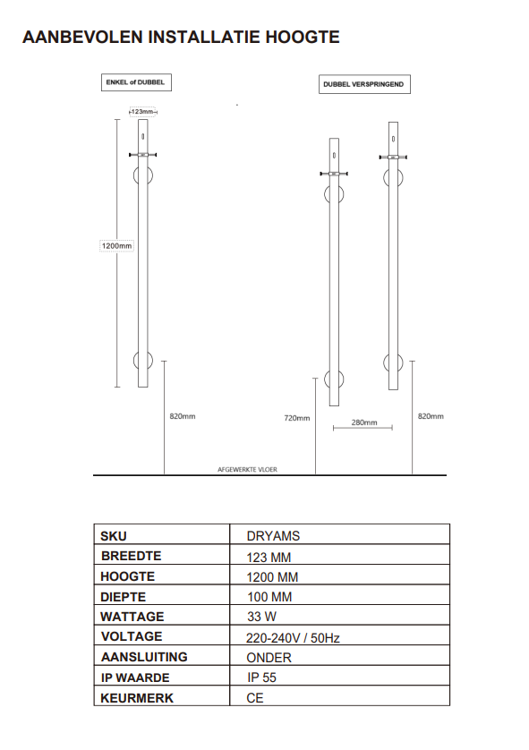 - Afmetingen: breedte 123 mm, diepte 100 mm, hoogte 1200 mm