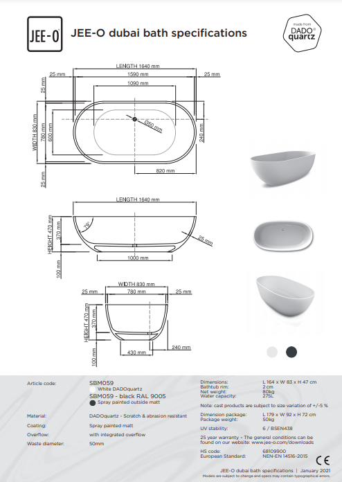 Dubai bad JEE-O, Het bad is gemaakt van DADOquartz en heeft een geïntegreerde overloop. Het bad is in verschillende kleuren verkrijgbaar. De afmeting van het bad zijn L 164 x B 83 x H 47 cm. Nu verkrijgbaar bij Stone Company.