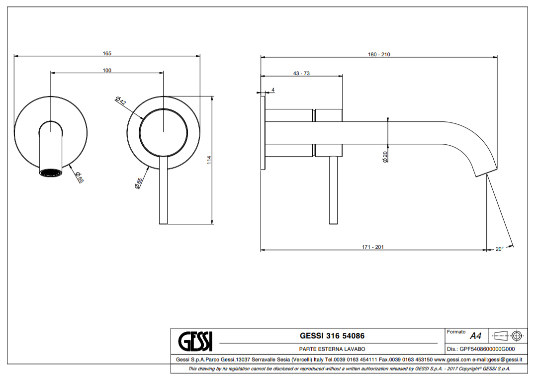 Inbouw wastafelmengkraan • Wandgemonteerd • Serie GESSI316 • Single lever bediening • External part • Te combineren met inbouwdeel 54198