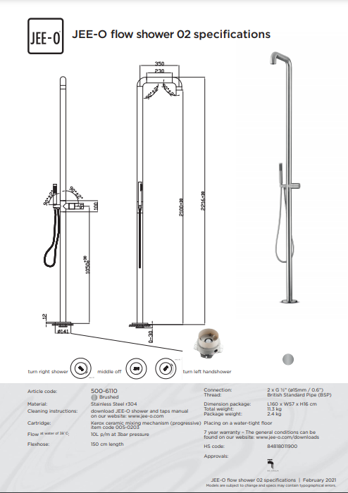 Flow douche 02 JEE-O, vrijstaande douche rvs met ééngreepsmengkraan, progressieve cartridge en handdouche verkrijgbaar bij
