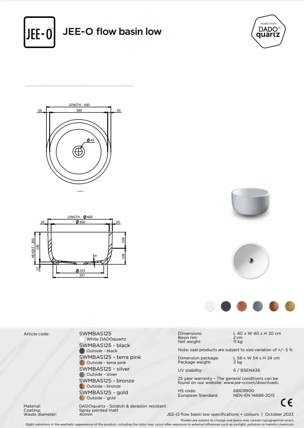 Flow waskom JEE-O, vrijstaande waskom gemaakt uit het materiaal DADOquartz. Deze waskom is verkrijgbaar in verschillende kleuren. De afmetingen zijn L 40 x B 40 x H 20 cm. Nu verkrijgbaar bij Stone Company.