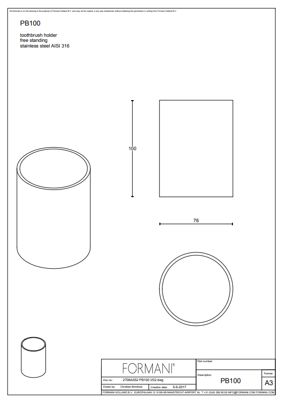 De Formani ONE Piet Boon vrijstaande tandenborstelhouder PB100 is een duurzame eyecatcher op uw wastafel. Hij is volledig gemaakt van roestvrij staal, waardoor hij perfect tegen water kan. Met een diameter van 76 mm en een hoogte van 100 mm neemt hij weinig ruimte in, maar biedt hij toch plaats aan meerdere tandenborstels. Dankzij de brede, zware bodem staat de houder altijd stabiel, zelfs wanneer hij vol staat met natte borstels.
