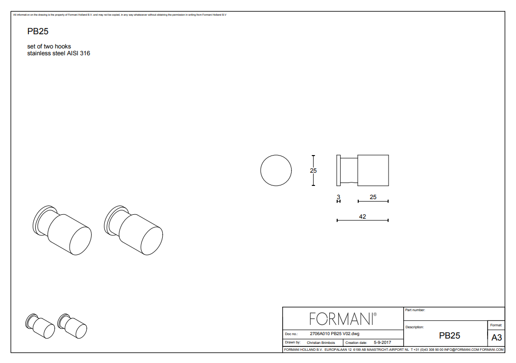 Formani ONE Piet Boon PB25 set van 2 haken. Ons assortiment bevat meerdere artikelen van de Nederlandse ontwerper Piet Boon. Piet Boon staat op het gebied van sanitair bekend om zijn strakke, minimalistische ontwerpen. De Formani ONE Piet Boon set van 2 haken (Artikelcode PB25) is een toonbeeld van minimalistische functionaliteit en vervaardigd uit roestvrij staal. Verkrijgbaar in mat roestvast staal, voegt deze duo–hook set een subtiele doch elegante oplossing toe voor het ophangen van handdoeken, badjassen of accessoires, zonder uw strakke interieur te doorbreken.