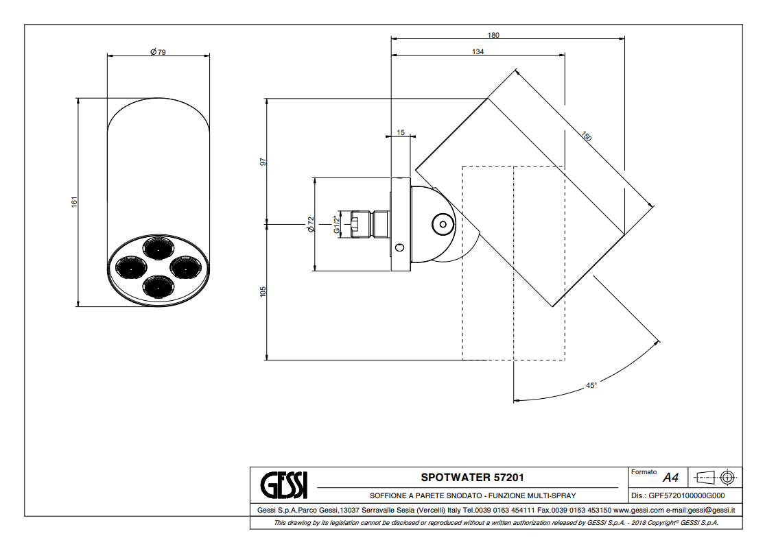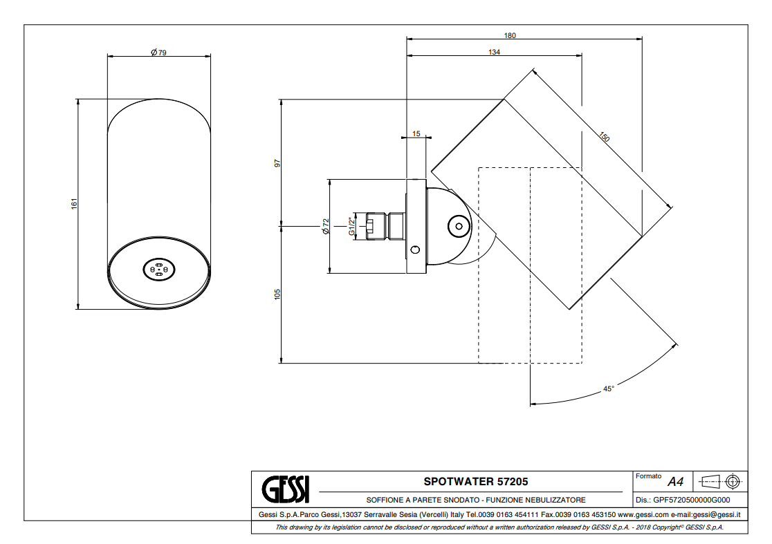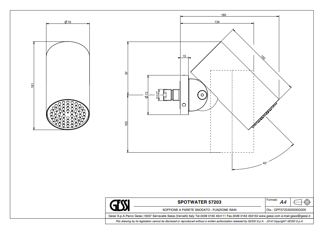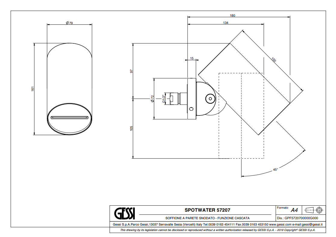 GESSI Flessa Spotwater 316, oriënteerbare wand-hoofddouchekop met Multispray-functie, Regen-functie, Verneveling-functie of Waterval functie, nu verkrijgbaar bij Stone Company.