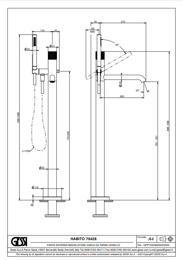 Afmetingen vrijstaande badkraan 70428: