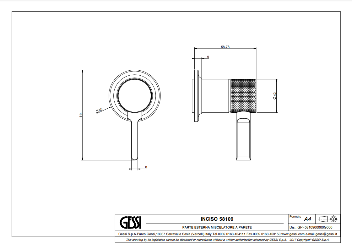 GESSI presenteert de Inciso mengkraan, onderdeel van de strakke Inciso-serie. De Inciso L variant model (artikelcode 58109) heeft een diepte van 78 mm, breedte van 65 mm en hoogte van 114 mm. Deze kraan wordt geleverd met het inbouwdeel 54055 voor muurmontage en kent één watertoevoer en omsteller. U bedient waterhoeveelheid en temperatuur met één hendel en schakelt moeiteloos tussen wastafel of douche.