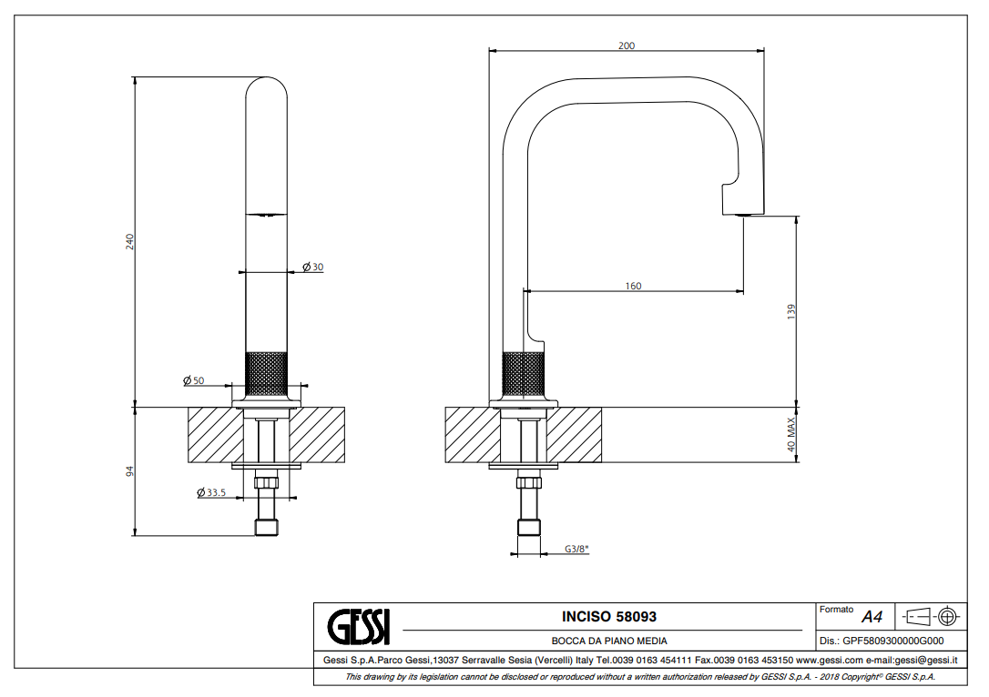 GESSI presenteert de Inciso wastafeluitloop, een slanke en strakke uitloop voor uw waskom. Met een diepte van 200 mm, een breedte van 50 mm en een hoogte van 240 mm vult u moeiteloos water in uw wastafel. De Inciso uitloop is ontworpen in de gelijknamige serie en past perfect naast de GESSI Inciso bladmengkraan (artikelcode 58200). U monteert de uitloop eenvoudig op uw wastafelblad voor een minimalistische en opgeruimde look.