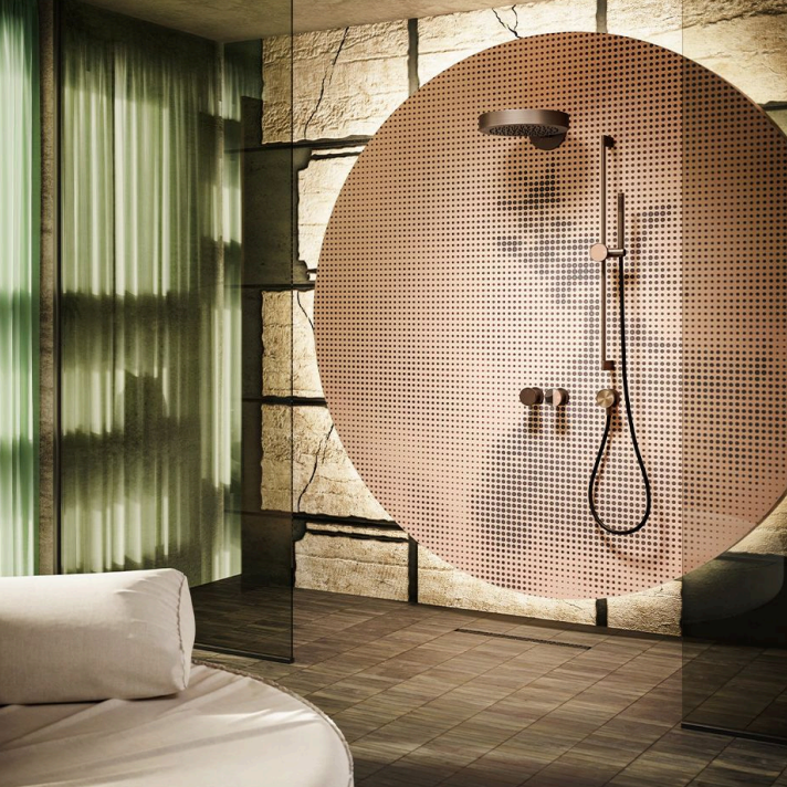 Origini serie, die op valt door zijn opvallende kleurafwerkingen en kleur combinaties. De doucheset bestaat uit vier essentiële onderdelen die perfect samenwerken voor een luxe douche-ervaring: