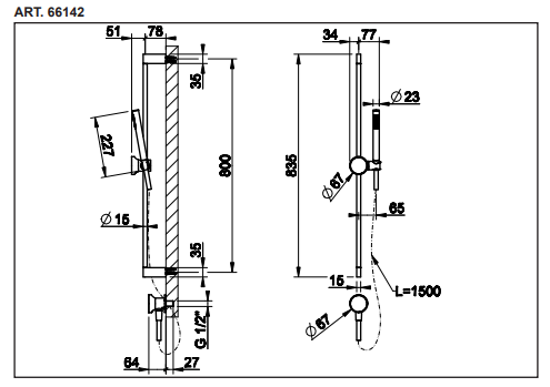 - 66142: Handdouche van 1,5 meter met een flexibele slang en wateraansluitpunt voor optimaal gebruiksgemak.