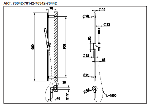 - 70042: Handdouche van 1,5 meter met een flexibele slang, glijstang en wateraansluitpunt voor optimaal gebruiksgemak.