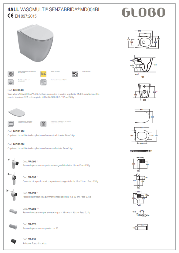 Belangrijke eigenschappen & Specificaties van het Globo 4ALL GLMD004 Staand Toilet