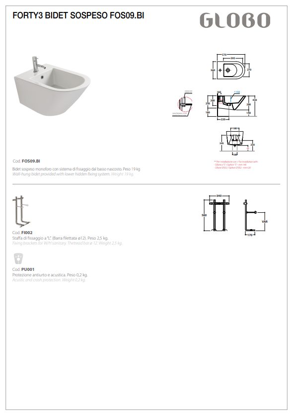 Belangrijke eigenschappen & Specificaties van de Globo Forty3 GLFOS09 Wandbidet