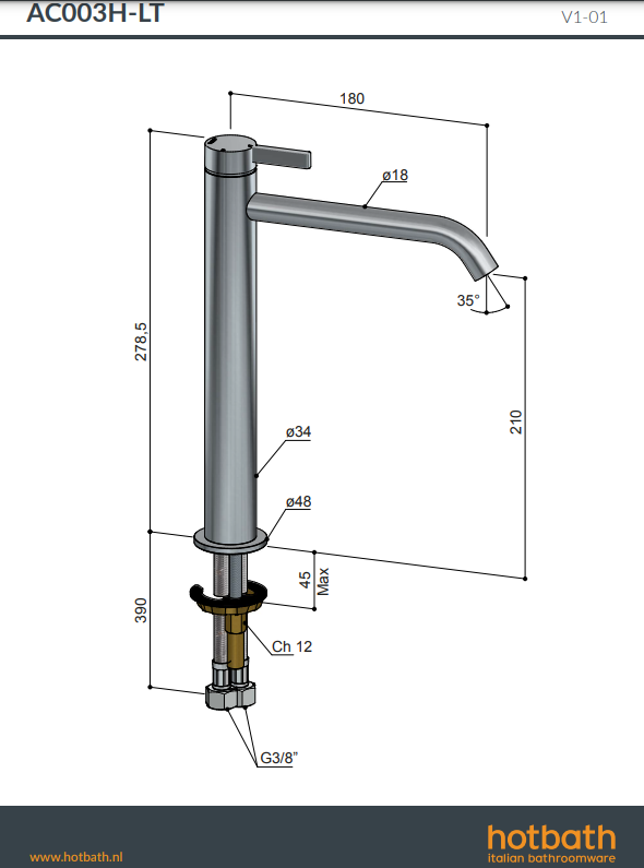 Ace AC003H wastafelmengkraan Hotbath H 278,5 mm x ⌀ 180 mm verkrijgbaar bij Stonecompany.nl.
