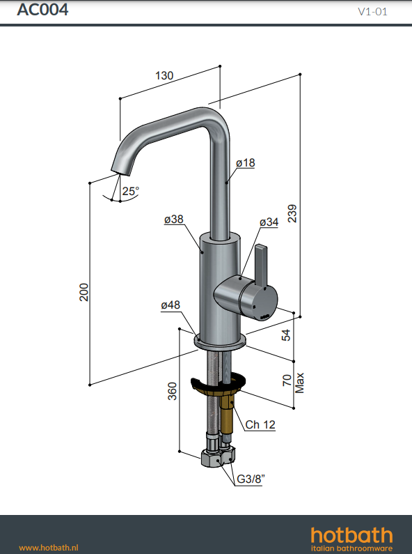 Ace AC004 wastafelmengkraan Hotbath H 200 mm x ⌀ 130 mm verkrijgbaar bij Stonecompany.nl.