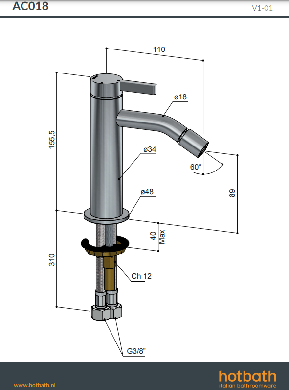 Ace AC018 bidetkraan Hotbath H 200 mm x ⌀ 130 mm verkrijgbaar bij Stonecompany.nl.