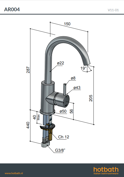 Archie AR004 wastafelmengkraan Hotbath. Wastafelmengkraan met draaibare uitloop, H 287 mm x D 150 mm verkrijgbaar bij Stonecompany.nl.