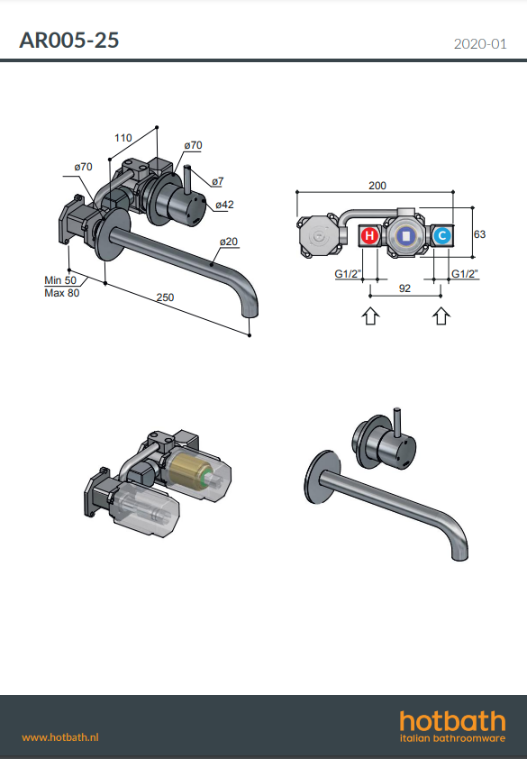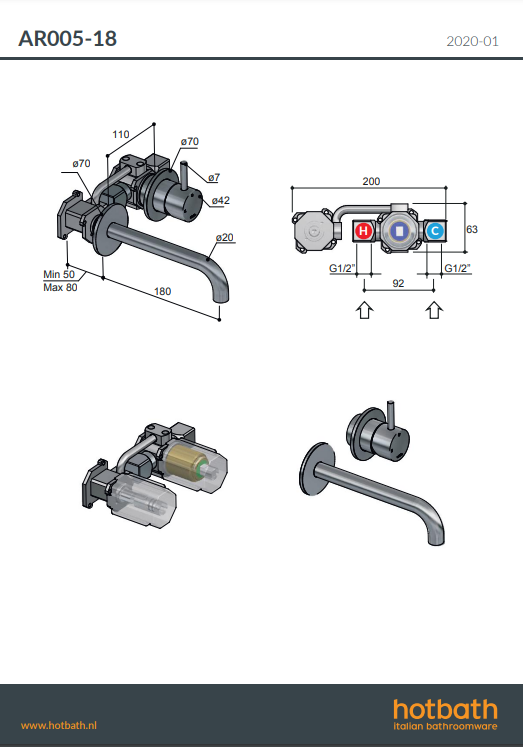 Archie AR105 inbouw wastafelmengkraan Hotbath (AR105-18) 180 mm of (AR105-25) 250 mm, verkrijgbaar bij Stonecompany.nl.